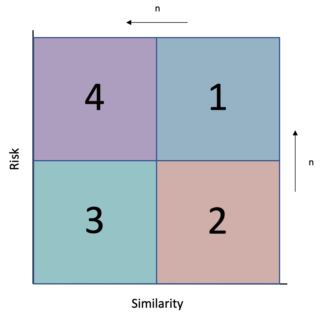 DSSG built a model to assess whether a facility would be found to have a violation if inspected. In addition, we also built a “similarity” model, assessing how similar a facility is to those previously inspected. Fewer than half of facilities have been inspected in the past, and they differ in significant ways from the rest, not the least of which is that they haven’t had safety complaints. By plotting risk score against similarity, DT can easily compare a facility’s risk and our confidence in the score. The higher the facility, the higher the estimated risk; and the farther right the facility, the more the facility is like other facilities that have been inspected. DT will want to inspect facilities from all four quadrants, but more from 1 and 4 than 3 and 2, and more from 4 and 3 than 1 and 2.