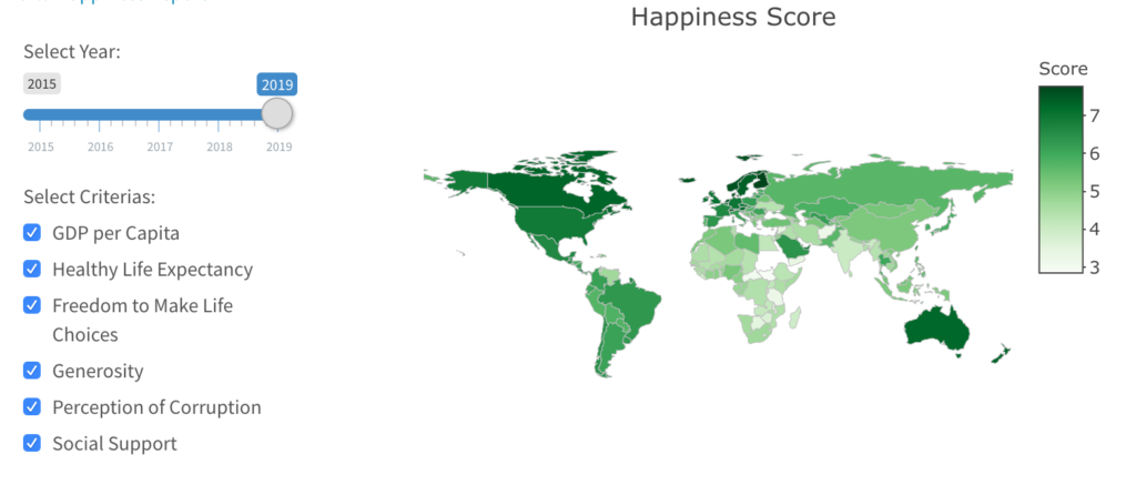 This map shows that Americas, Europe, Australia and New Zealand have higher happiness score than Africa and Asia for the year 2019. Since everyone has different priorities that make their lives happy, users can choose the criteria that are most important for them and investigate how countries rank based on their individual preferences for happiness.