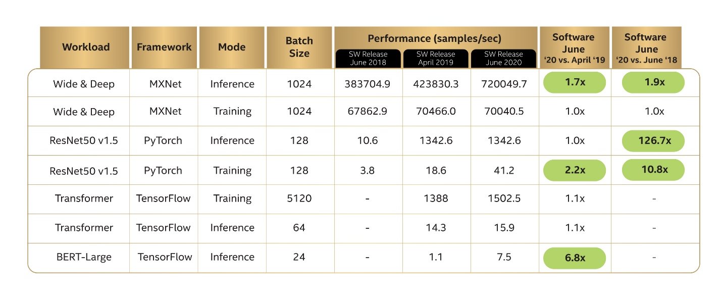 Intel® Xeon® Scalable platforms provide the foundation for an evolutionary leap forward in data centric innovation. Intel® Deep Learning Boost is a technology that has built-in AI acceleration to enhance artificial intelligence inference and training performance. Specifically, for the 3rd Generation Intel Xeon Scalable Processors that was announced in June 2020, it was the industry’s first x86 support of Brain Floating Point 16-bit (blfoat16) and Vector Neural Network Instructions (VNNI). The enhancements in hardware architecture, coupled with software optimizations deliver up to 1.93x more performance in AI training and up to 1.9x more performance in AI inference compared to 2nd Generation Intel Xeon Scalable processors1.
