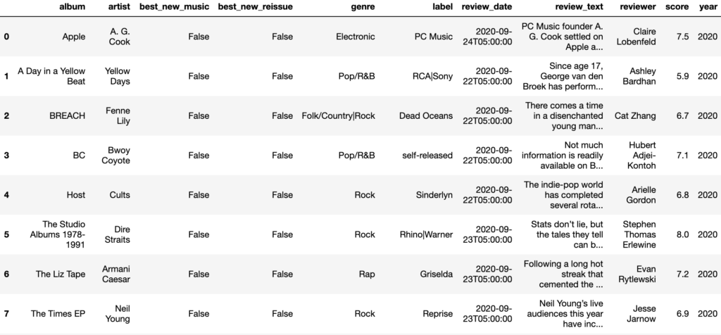 For this project, I scraped data from over 20,000 album reviews on pitchfork.com, specifically album title, artist, genre, release year, record label, review date, reviewer name, review text, review score, and whether the album had been given one of two distinctions, “Best New Music” or “Best New Reissue.” A snapshot of the data is shown below.