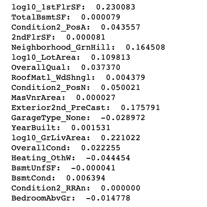 Next, we evaluated p-values and R-squared using Statmodels. With the features selected by Lasso the model returned .92 and .91 R-squared for its train and test set. We left only 7 features for our final model, which returned .92 for both train and test set: