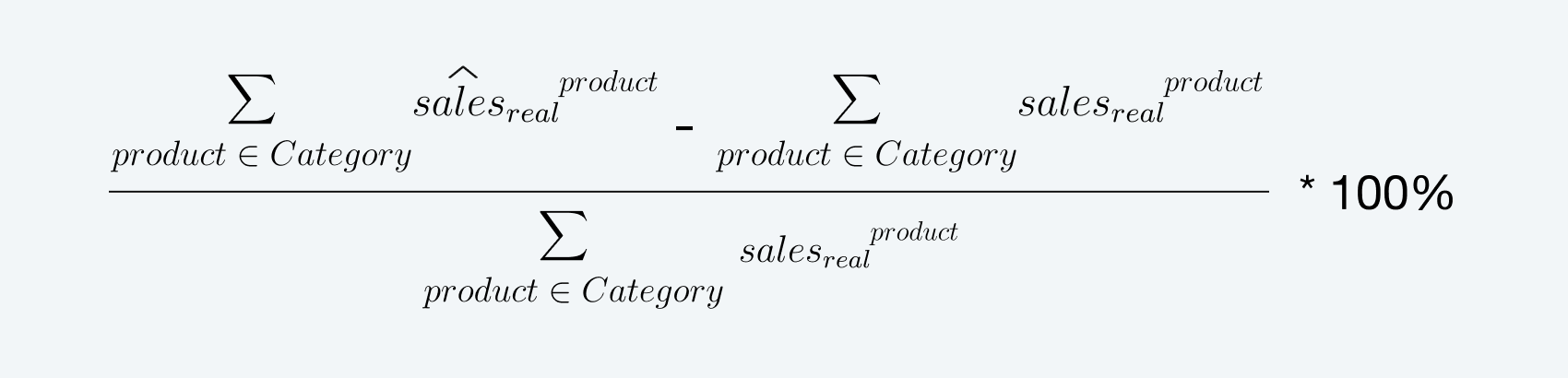 The main evaluation criteria for the Balsam Brands sales forecasting model was the accuracy of sales and revenue forecast for the aggregate test period (8 weeks of high season sales) at the category level – separately for one category (~ 30% of total assortment, ~ 75% of total revenue) and aggregated for the rest of assortment. It can be described by formula: