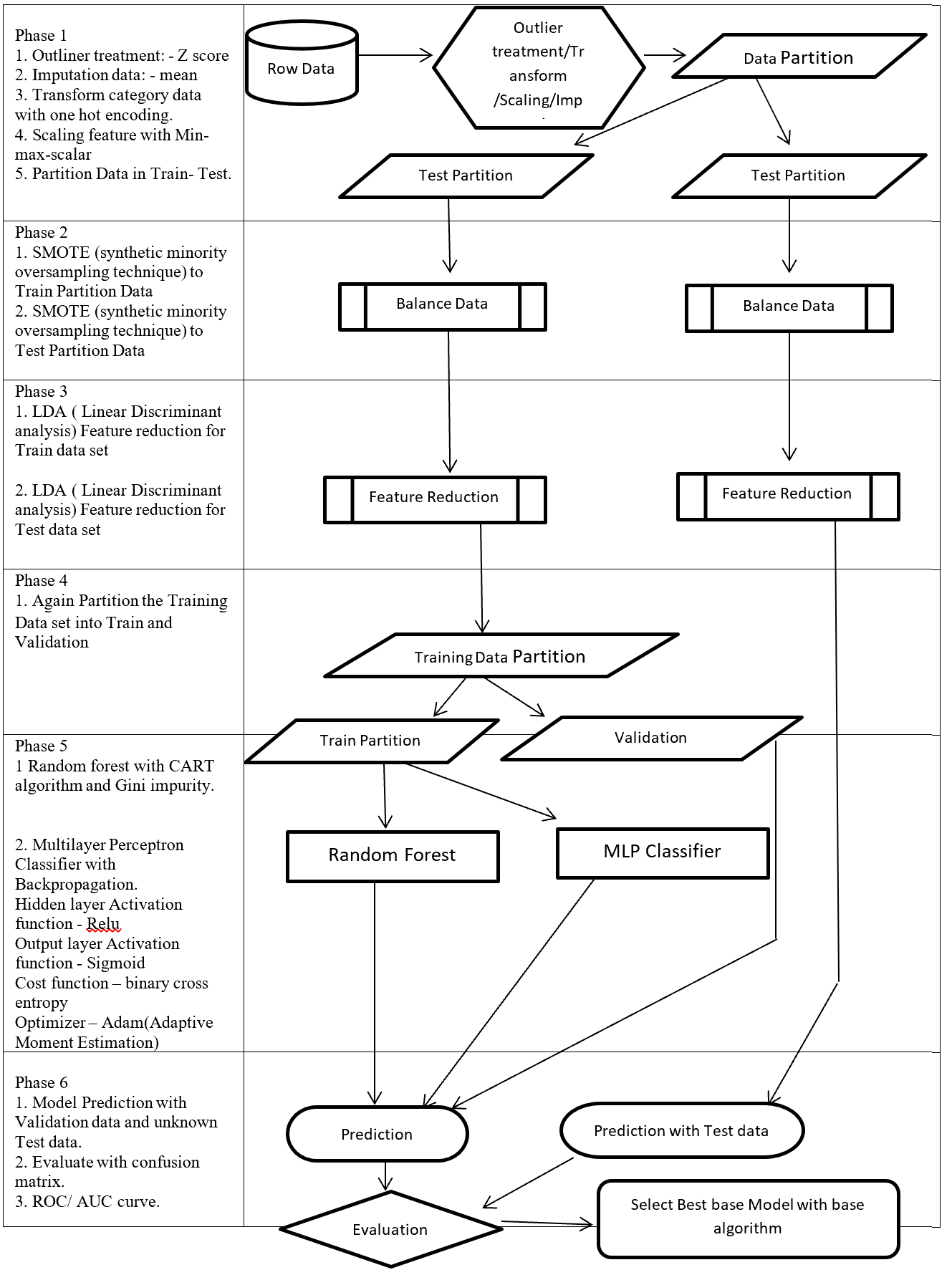 Phase 5: This Phase considering several base algorithms as a base model like CNN, RNN, Random forest, MLP, Regression, Ensemble method. This phase also involve to find out best hyper parameter and sub-algorithm for each base algorithm. As an example on this paper consider two class classification problems and also consider Random forest (Included CART – Classification and Regression Tree and GINI index impurity) and MLP classifier (Included (Relu, Sigmoid, binary cross entropy, Adam – Adaptive Moment Estimation) as base algorithms.