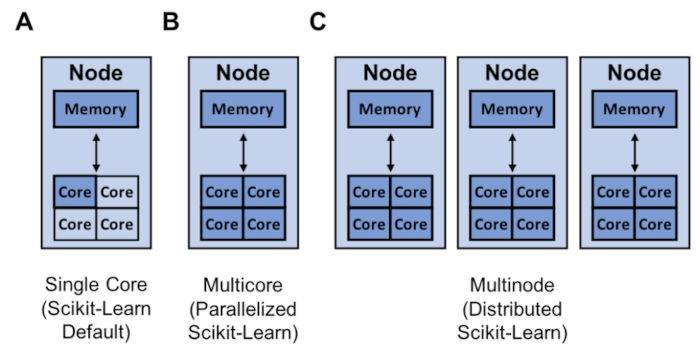 Resources (dark blue) that scikit-learn can utilize for single core (A), multicore (B), and multinode training (C).