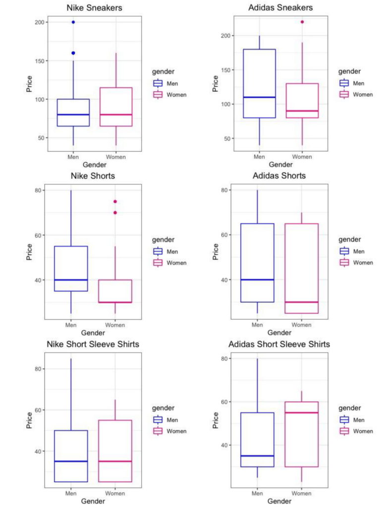 I decided to analyze three activewear categories: sneakers, shorts, and short sleeve shirts. I specifically chose these three categories because I wanted gender to be the only independent variable in my study. In these three categories, the types of styles available seem to be similar for both genders, lending to the opportunity for a fair analysis of the influence of the specific factor of gender on activewear prices and variety.