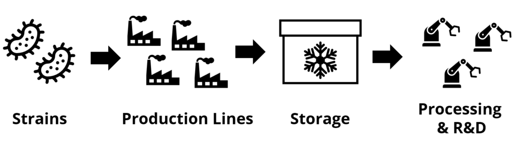 Froyo can be made from one of several strains of bacteria. Once the fermentation is completed, the yogurt is stored either alone or the product of several lines is combined to create a larger batch. These batches are stored in the freezer until they can be used by one of the downstream groups. The two largest groups are Process, who prepare froyo for sale, and Experimental, who act as R&D for new flavors or production techniques.
