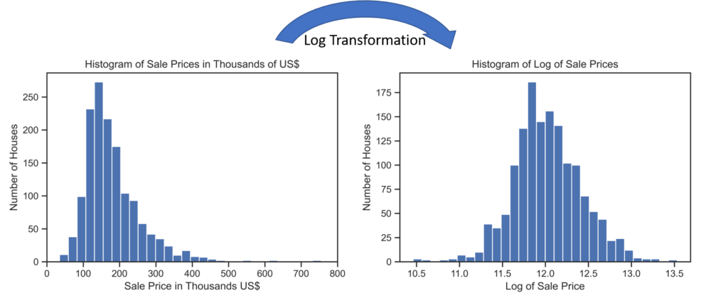 We notice a high right skew for sale prices, which can create issues with our models. To address that, I applied a log transformation to adjust it to a more normal distribution which can help deal with extreme values and improve predictions.