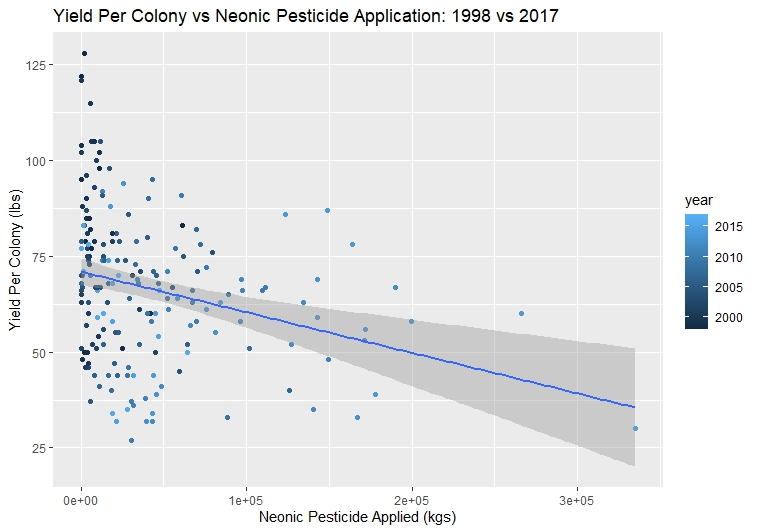 Due to the financial and scientific benefits that come from understanding this type of information, I chose a dataset that was aggregated from the National Agricultural Statistics Service (NASS), the USGS, the US Census, and the USDA, that covers honey production, pricing, value and yield, in conjunction with the neonic pesticide use in the corresponding part of the United States. The data spans from the early use of neonic pesticides in 1998, all the way to its decline in use in 2017. In my analysis, I chose to focus on the top ten honey producing states from the dataset. RStudio, ggplot2, dplyr and tidyr were used to refine, process and analyze the dataset, and a RShiny app was developed to interact with the data in a user friendly way. The original dataset can be downloaded from (Kaggle), the github repository (here), and the app can be accessed (here).