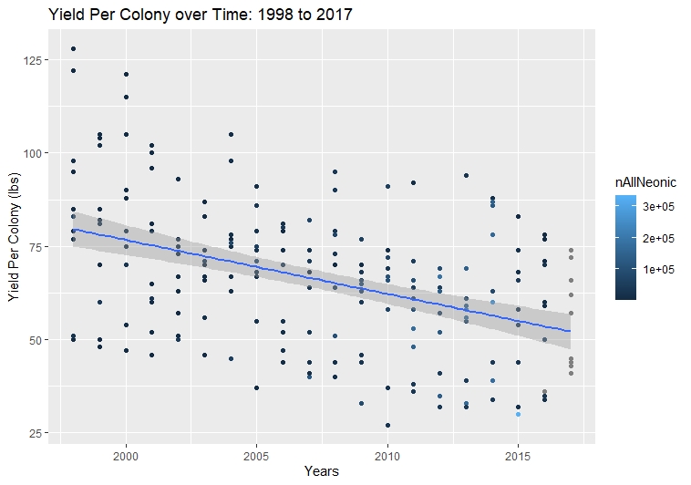 Many arthropods, especially honeybees, are very sensitive to environmental factors, both biotic and abiotic in nature. A change in weather, chemical runoff, land development, disease and food availability, can have drastic effects on honey production and honeybee health. Honey production may vary dramatically year to year, due to these ever changing factors, so to start, one wants to look at the long term effects. Do we see any significant changes from when neonic pesticide use began, and do we see any lingering effects from after it ended.