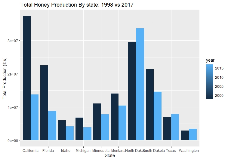 Here we can see illustrated, the total production (lbs) of honey per state, in 1998 (dark blue) and the more production figures from 2017. Of these ten states, overall, there was no significant difference in collective honey production between 1998 and 2017, however, you can easily see that the changes vary from state to state. Some show increases in production, and many show decreases, but only a handful show any visually striking changes. The biomes of these states differ dramatically, and many factors can be the cause of these changes specific to those locations.