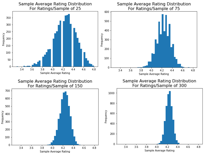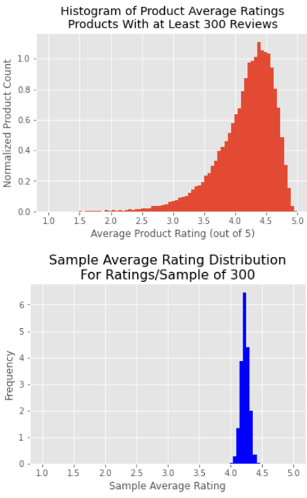 The next important question to address was how many reviews an individual product needed in order to have a meaningful average rating. Without a large enough number of reviews, the presence (or lack of presence) of just a few negative reviews could greatly change the average rating observed. In order to analyze this, random sampling was conducted on a ‘typical’ item to observe the sample outcomes from a population with known characteristics. To choose the item to conduct random sampling upon, the dataset for individual item averages was filtered for ratings distributions close to the median proportions for each star-rating level, and then ordered by number of reviews. The individual item chosen had a very ‘typical’ distribution and a large number of reviews (14,114). Five thousand trials were then drawn from this set of reviews, with differing numbers of reviews per trial in different sets of tests. By the time the number of reviews included per trial climbed to 300, 90% of the observed averages fell within roughly +-0.10 stars of the true product average.