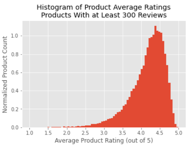 After grouping the reviews by product, the graphical representation of the average product rating distribution revealed neatly organized data. The data took on the appearance of a normal distribution with a very fat lower tail.