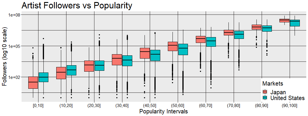 With this in mind, we move on to determining whether this trend exists in foreign markets as well. It is likely that this trend is present in all markets for several reasons. First, the scoring system used by Spotify is the same across all markets. Second, highly popular artists likely have an international presence. We will also briefly explore the genres of US artists, to see if there is anything that may help us understand how a US artist can grow their popularity. Confirming this trend will help us set a baseline for future work.