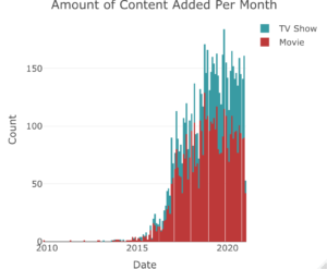 For this project, I decided to analyze a data set of Netflix Movie and TV show Titles to see what common trends have occurred over the years. Netflix is one of the biggest video streaming services on the planet with over 7,787 pieces of content on their platform at the time of this data set’s collection. With its start as a DVD rental platform, Netflix has risen to make a huge name for itself announcing in 2019 that they had signed on 135 million paid customers worldwide. A huge factor to their success is the underlying use of Big Data. By gathering information from practically every customer interaction, Netflix is able to get access to the minds of their viewers and recommend what they would like to watch next before they even finish their current movie or show. In this analysis, I wanted to examine the addition of content to Netflix in search for trends and similarities from all regions of Netflix’ reach over the world.