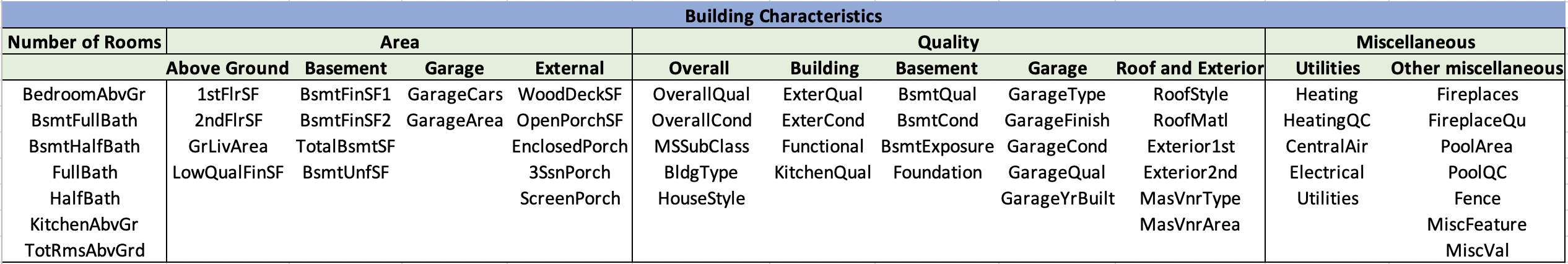 Further, we found only 1 continuous feature i.e. ‘Lot Frontage’ (linear feet of street connected to property) to contain 462 missing values. We imputed these using the mean Lot Frontage of houses in the neighborhood in which the missing value house fell into. Once missingness was taken care of, we split the features up into various groups i.e. building characteristics, external/lot characteristics, sale type, neighborhood, time of sale (year and month sold). The building characteristics were further sub-classified as illustrated below in Table 1.