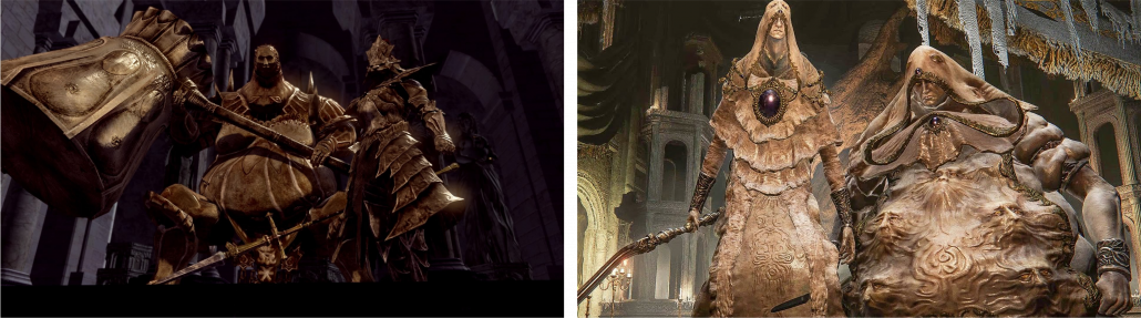 The childhood nightmare strikes back. Left: the iconic and notorious boss duo Ornstein and Smough in Dark Souls (2011), right: Godskin Duo in Elden Ring (2022).